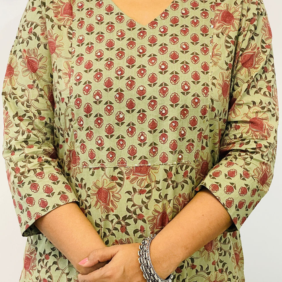 Add a touch of elegance to your wardrobe with this delightful green suit set featuring vibrant pink floral motivs. Perfect for casual and festive occasions, this three-piece ensemble includes a kurta, matching trousers, and a stunning dupatta.